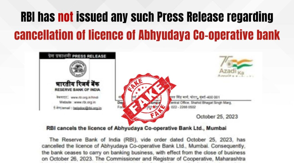 We are reproducing a few excerpts of the fake press release which reads, “The RBI vide order dated October 25, 2023, has cancelled the license of the Abhyudaya Cooperative Bank Ltd. Mumbai. Consequently, the bank ceases to carry on banking business, with effect from the close of business on October 26, 2023”.