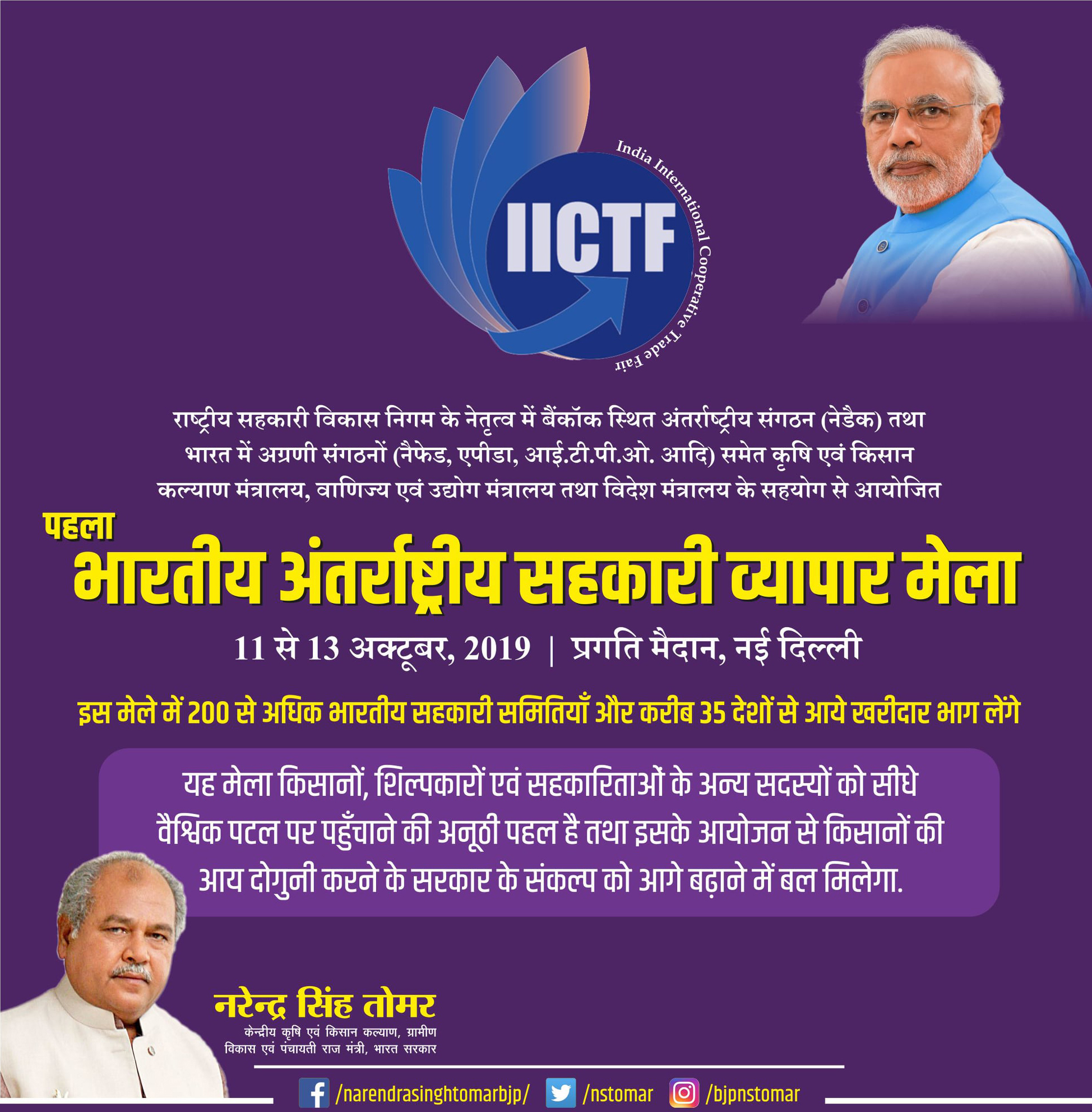 The IICTF, the acronyme used for the Co-op Fair, is basically aimed at realizing the vision of the Prime Minister of doubling farmers’ income, said Tomar. PTI quotes the Minister saying as 94 per cent of our farmers are members of at least one co-operative institution, the co-operative sector has a formidable role in increasing agriculture exports from the current USD 30 billion to USD 60 billion by 2022.