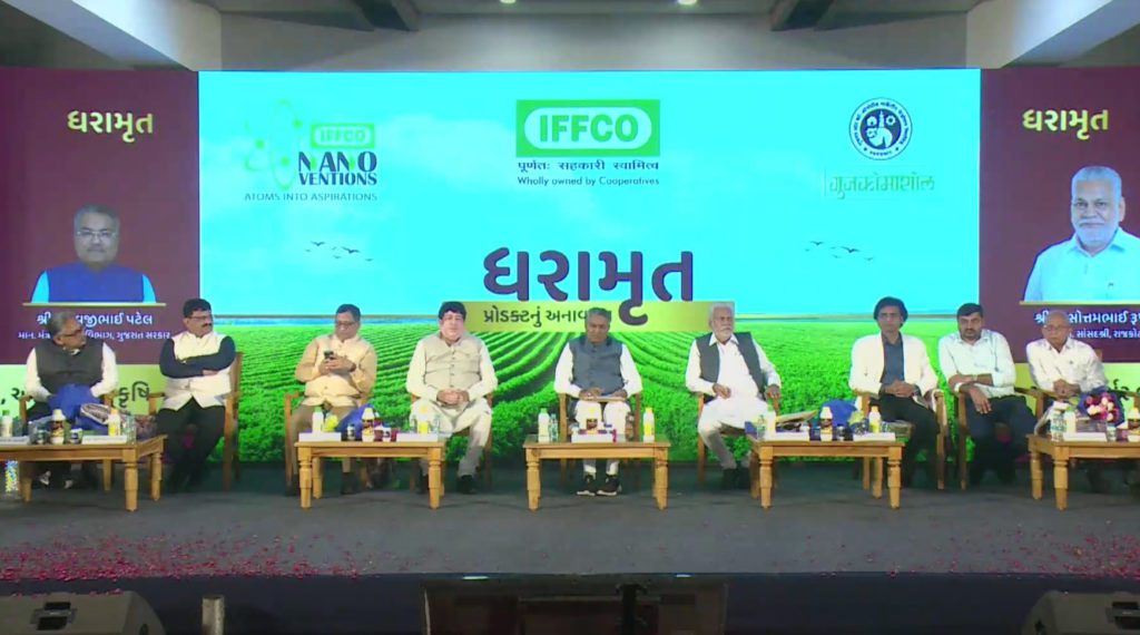 The event was graced by Raghavji Bhai Patel, Agriculture Minister, Government of Gujarat, as the Chief Guest. Other notable attendees included MP Purushottam Rupala, IFFCO Chairman Dileep Sanghani, Managing Director K J Patel, IFFCO-Nanoventions MD Dr. A Laxmanan, Director Bhavesh Radadiya, Unit Head Sandeep Ghosh, Marketing Director Yogendra Kumar, the State Marketing Manager, and a large gathering of farmers and cooperators from across the state.