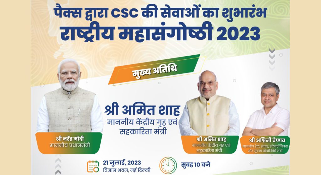 Union Home Minister and Minister of Cooperation Amit Shah will inaugurate a ‘National Seminar on Delivery of CSC services through Primary Agricultural Credit Society (PACS)’ at Vigyan Bhawan, New Delhi on 21st July, 2023. Union Minister for Electronics and IT, Ashwini Vaishnaw will also be present.