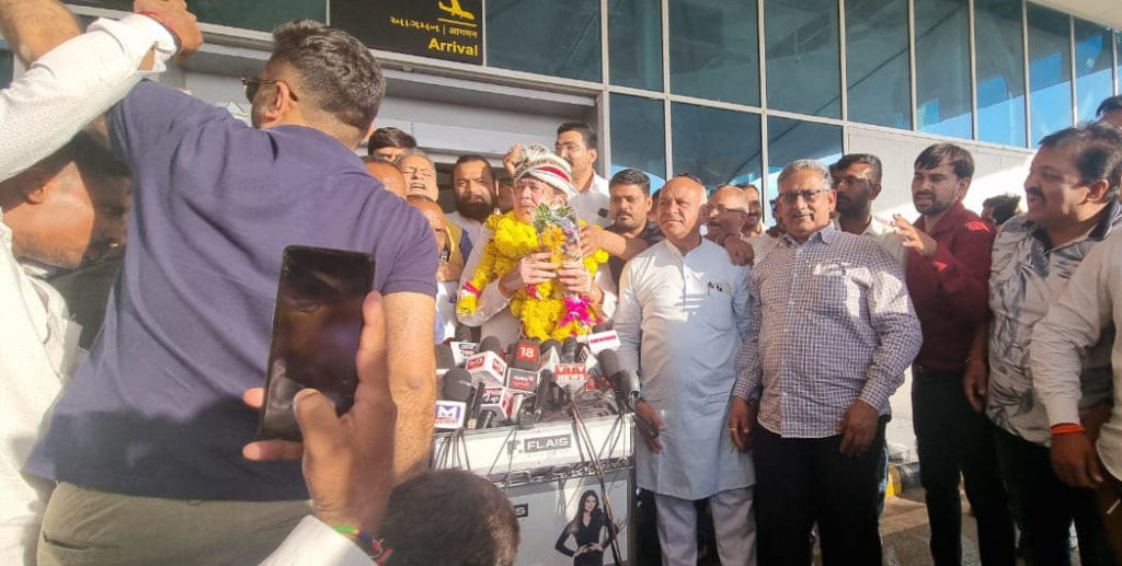 At the Rajkot airport, local cooperators and BJP workers rushed to greet Sanghani, who graciously thanked them for their warm reception. A frenzy of excitement ensued as people clamored to garland him.