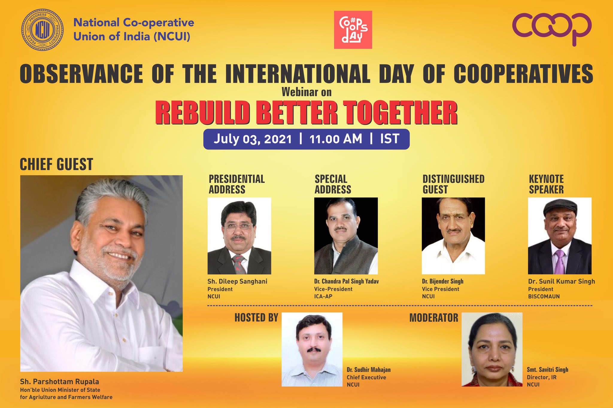 The apex body of co-ops-NCUI is organizing a webinar in which Union Minister of State for Agriculture Parshottam Rupala would be the Chief Guest and the function would be presided over by the NCUI President Dileep Sanghani.