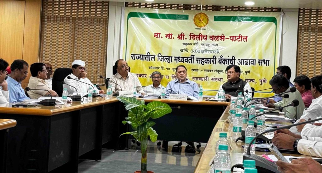 Maharashtra Cooperation Minister Dilip Walse Patil presided over the meeting of Chairmen and CEOs of District Central Cooperative Banks on Monday. Mumbai DCCB Chairman Pravin Darekar, Cooperative Commissioner of Maharashtra, MSC Bank Administrative Board Chairman Vidyadhar Anaskar, all Joint Registrars of Maharashtra and others were present on this occasion.