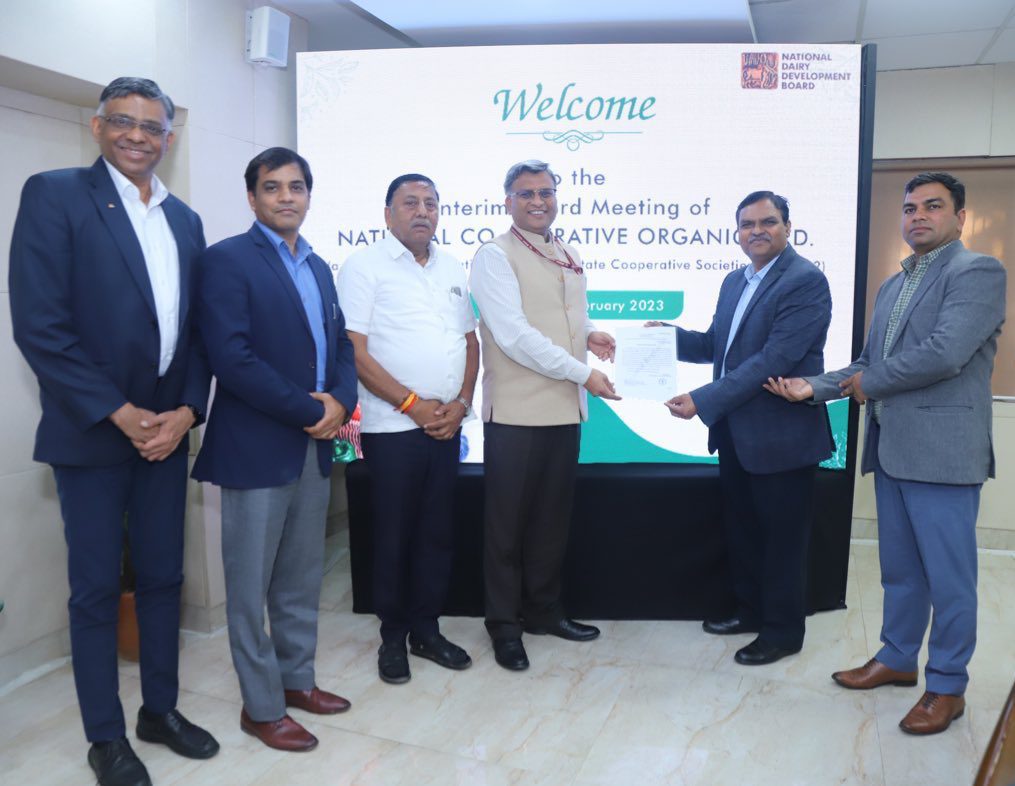 Chairman, NDDB as Chief promoter received Certificate of Registration of National Cooperative Organics Ltd from MD, NCDC at NDDB Delhi where Interim Board Meeting was organised under the Chairmanship of Meenesh Shah.
