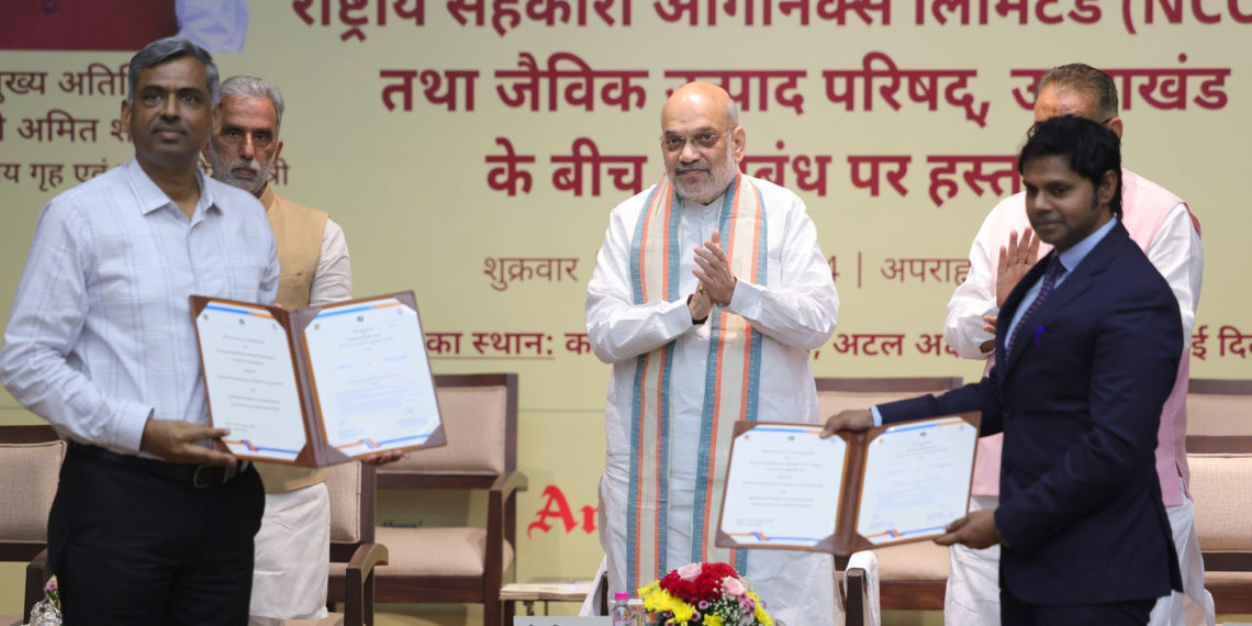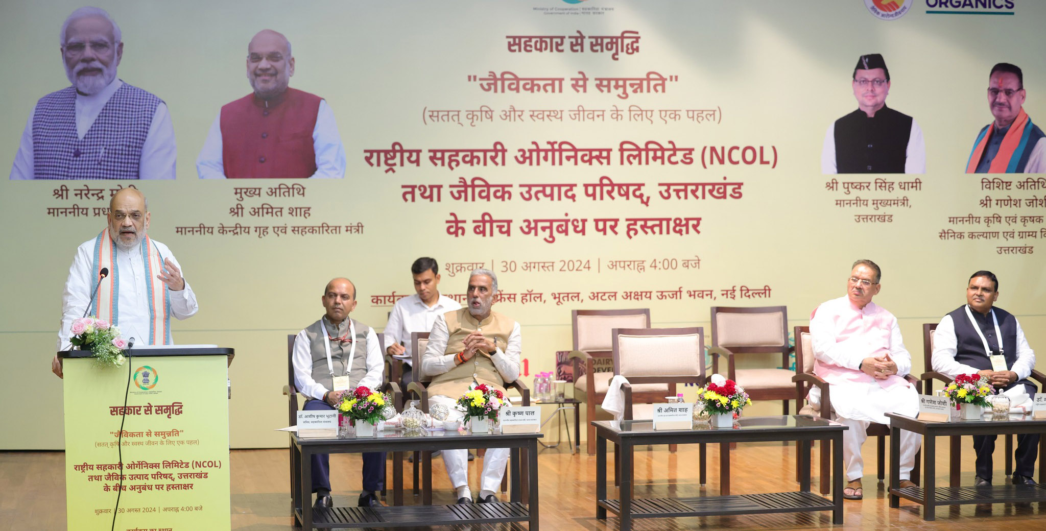 A Memorandum of Understanding (MoU) was signed between National Co-operative Organics Limited (NCOL) and the Uttarakhand Organic Commodity Board (UOCB) in New Delhi on Thursday in the presence of Union Minister Amit Shah, MoS Krishna Pal Gurjar, Uttarakhand’s Agriculture and Farmers Welfare Minister, Ganesh Joshi, and Dr. Ashish Kumar Bhutani, Secretary of the Ministry of Cooperation.