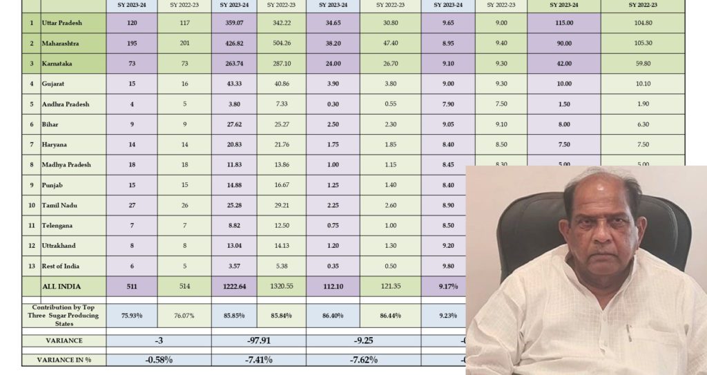 The state-wise performance showcases Maharashtra taking the lead with 195 sugar mills, crushing 427 lakh tonnes of sugarcane and producing 38.20 lakh tonnes of new sugar. Following closely, Uttar Pradesh boasts 120 factories that have crushed 359 lakh tonnes of sugarcane, resulting in a production of 34.65 lakh tonnes of new sugar. Karnataka secures the third position, with 73 factories contributing to the crushing of 264 lakh tonnes of sugarcane and the production of 24 lakh tonnes of new sugar.