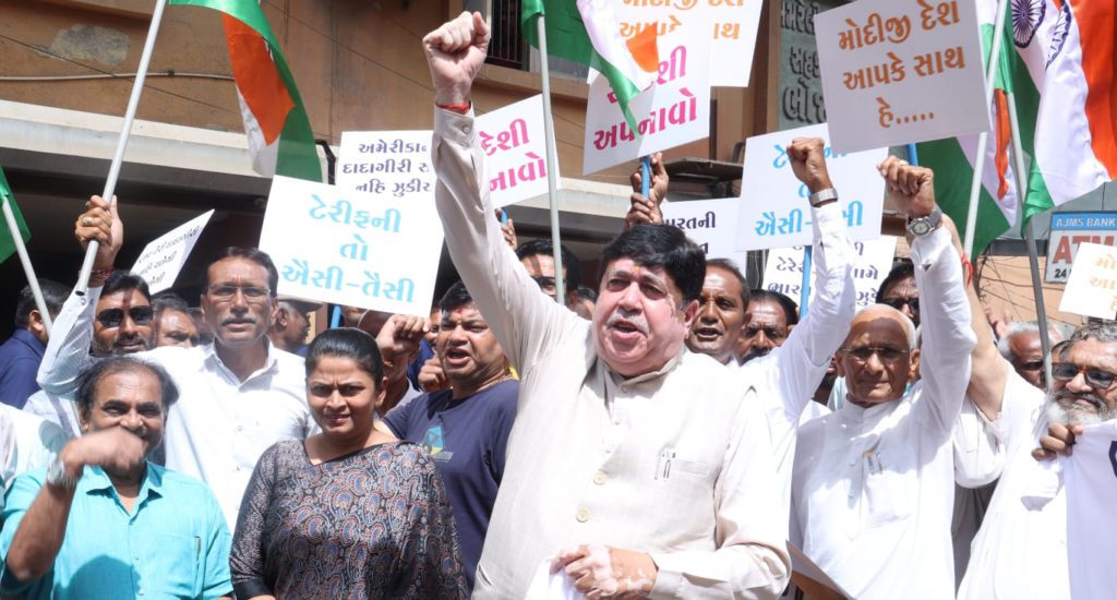 Acting under the banner of the Bhartiya Jan Parishad, Sanghani, along with a team of supporters, took to the streets in Amreli to denounce what he described as “American bullying” in trade matters. The protest was the first of its kind in the state and drew large participation from citizens who rallied in support of a boycott of American goods.