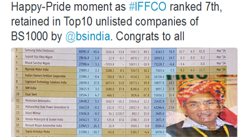 Sharing the good news Dr. U S Awasthi tweeted on Wednesday “Happy-Pride moment as #IFFCO ranked 7th, retained in Top10 unlisted companies of BS1000 by @bsindia. Congrats to all”.