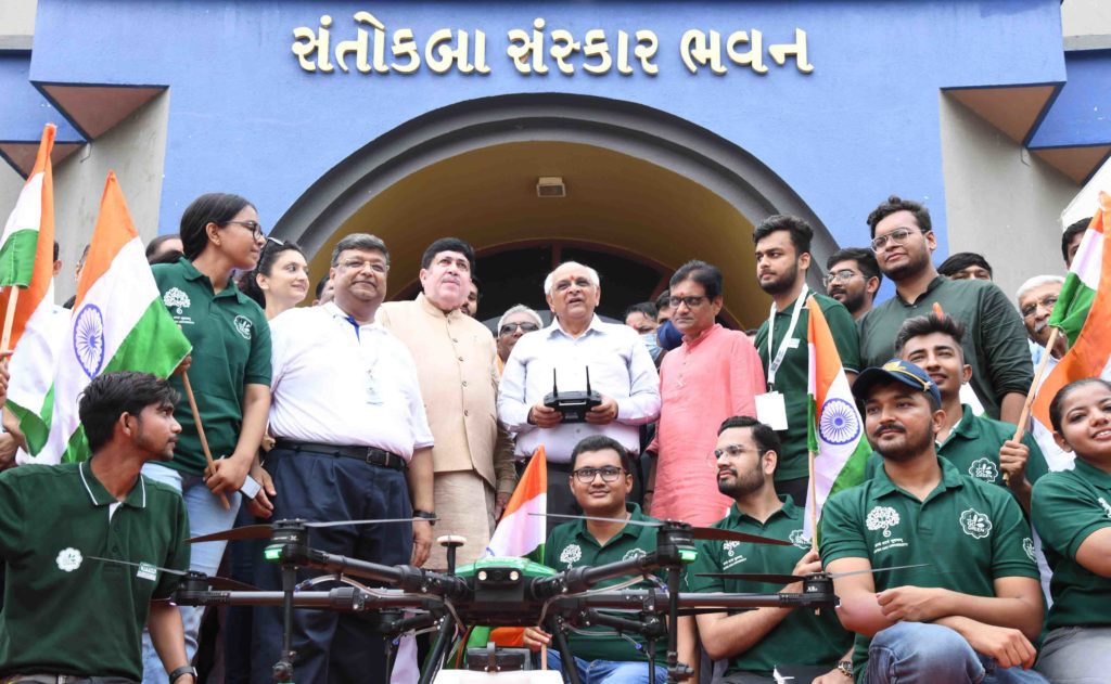Gujarat Chief Minister Bhupendra Patel inaugurated spraying of Nano urea in the field through drone technology for the first time from Isanpur Mota village of Gandhinagar district in Gujarat. The Chief Minister kick-started this historic initiative of the state government by filling the drone with Nano urea and operating the drone. IFFCO Chairman Dileep Sanghani was by his side at the event.