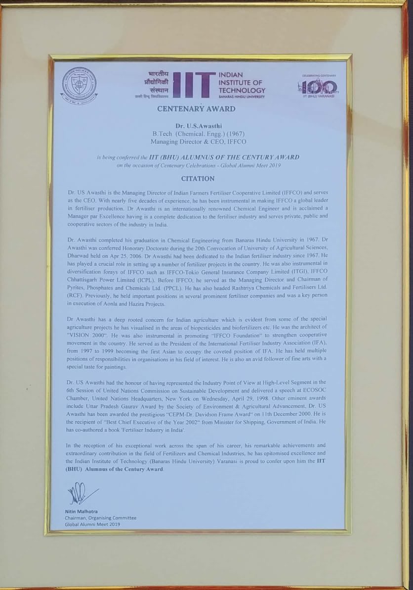 Signed by Nitin Malhotra, Chairman of the organizing committee Global Alumni meet 2019, the citation reads that Dr Awasthi has played a crucial role in setting up several fertilizer projects in the country and was also instrumental in effecting diversion forays of IFFCO which has more than 17 subsidiaries today.
