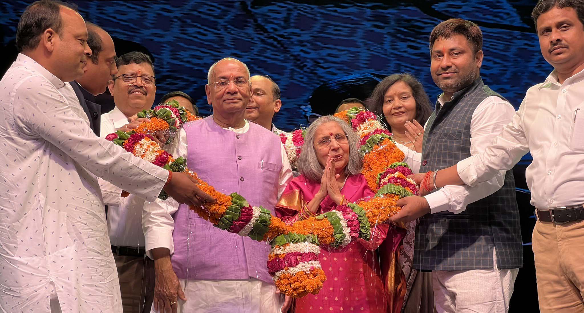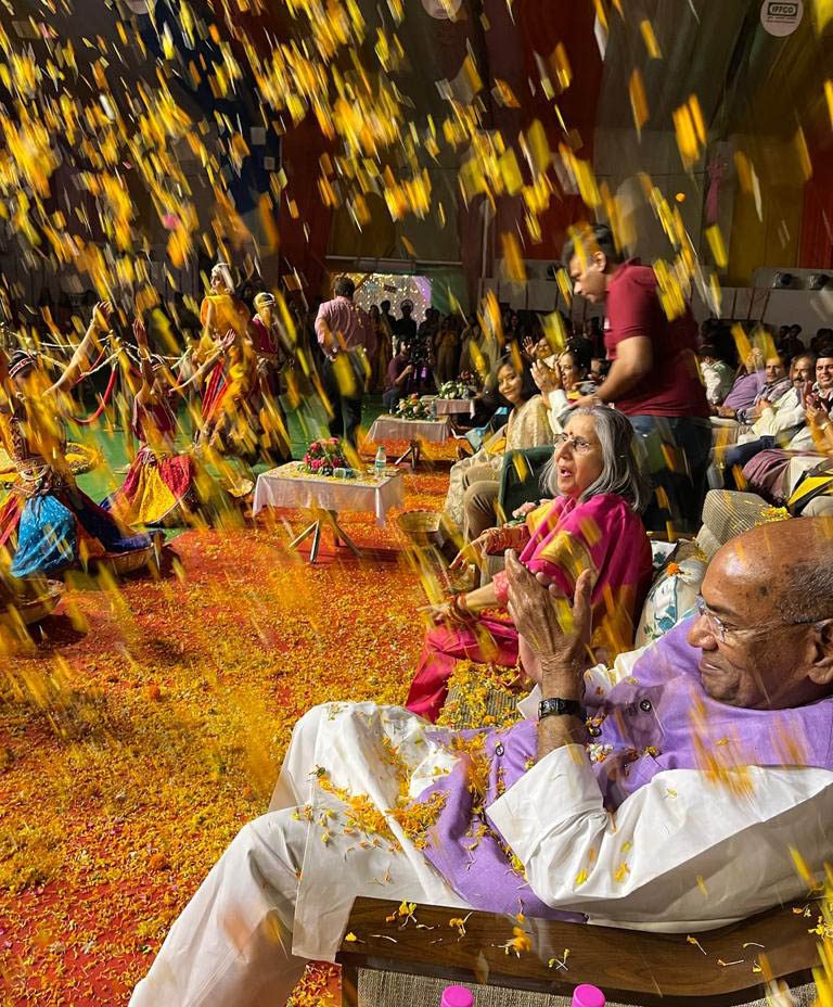 Some of the programs presented on this occasion included a brilliant performance by Mehak Jadeja showcasing different forms and moods of the Goddess Durga. The dramatization of Mahabharat, Jatra and what is known as “Sanatani 5G” by Kalol Unit were captivating. The Phulpur Unit presented a dramatization of Rabindranath Tagore’s Geetanjali and Ras Nritya depicting Radha and Krishna  on the occasion. The crescendo of The  Ras Leela was reached  when  participants rushed down from the stage to the audience and began to shower flowers on them. Awasthi and his wife soon got drowned with petals, presenting a unique scene.