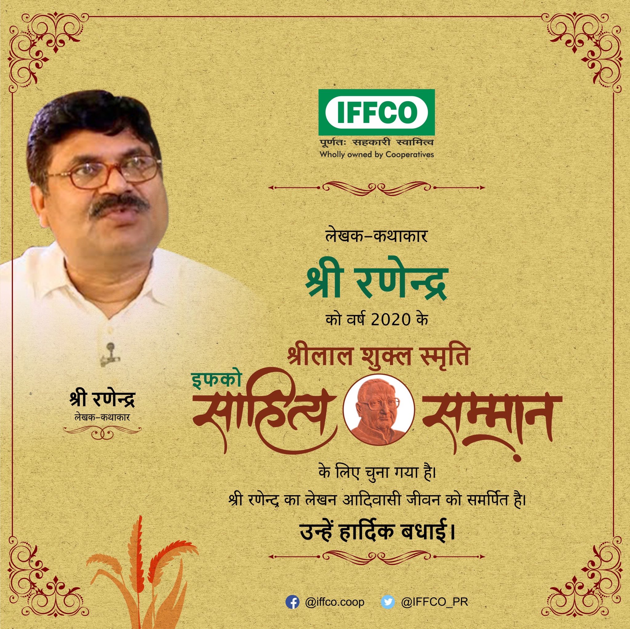Congratulating Shri Ranendra, IFFCO MD tweeted “It’s a great pleasure to inform you all that Shri Ranendra whose writings on tribal life is the winner of this year’s Srilal Shukla Smiriti IFFCO Sahitya Samman. In IFFCO, we also encourage literature and art”.