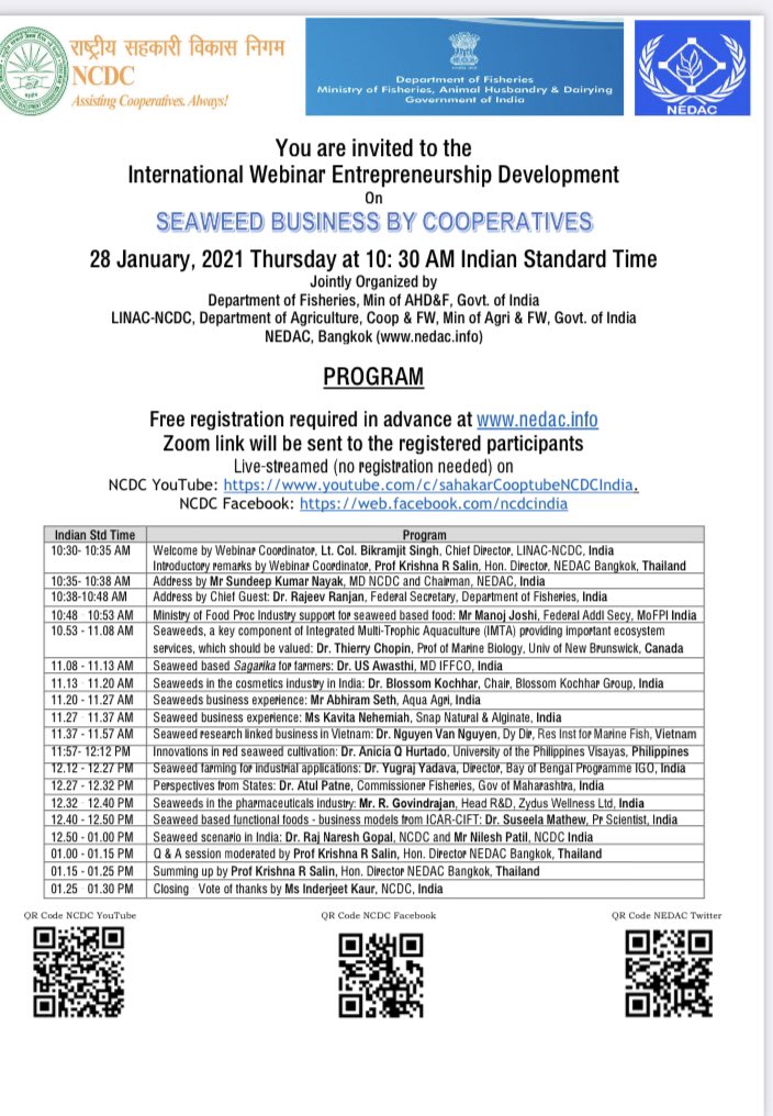 “The aim is to bring stakeholders on one platform and work towards forging alliances for promotion of entrepreneurship in seaweed business through cooperatives. At the same time, the webinar will identify bottlenecks at various levels and will aim at evolving options”, reads a press release from NCDC.