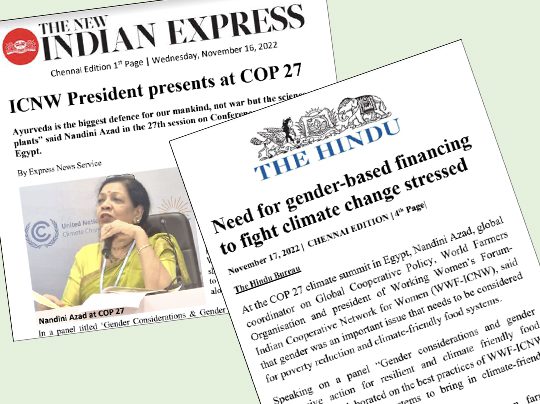 “Working Women’s Forum (WWF) and Indian Cooperative Network for Women (ICNW) have proven how civil society and NGO can provide best solutions for climate change & poverty through financial inclusion & indigenous methods to the poor women farmers” said Dr Nandini Azad speaking during the COP 27 being held in Egypt.